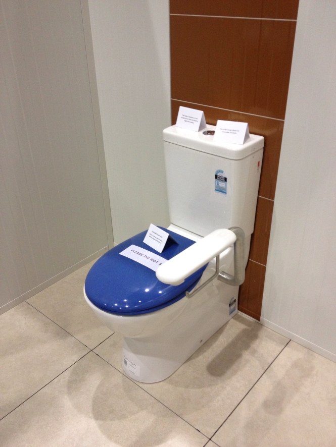 Sanitario de color contrastante para fácil localización. Más alto y con baranda para mayor comodidad.