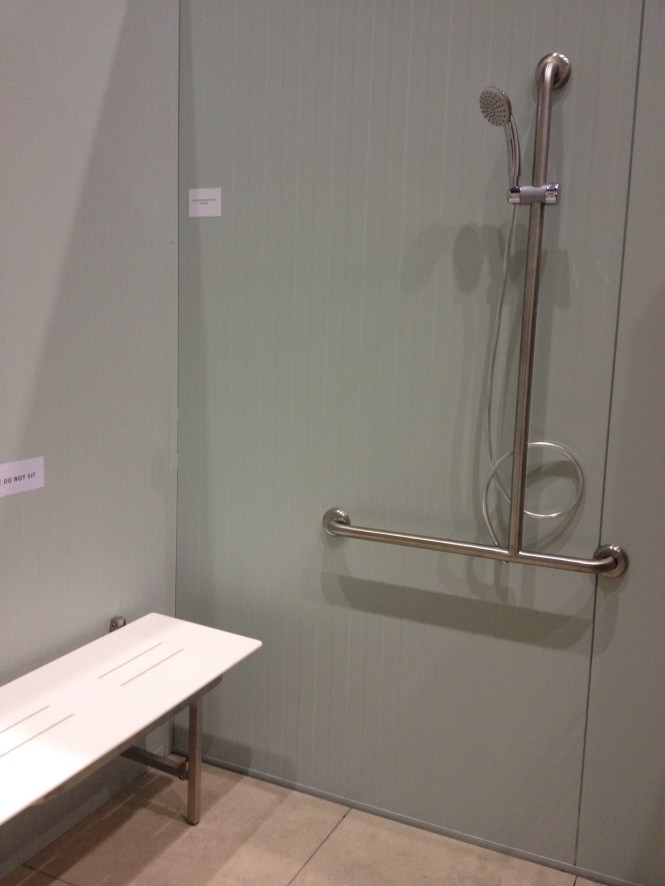 Ducha amplia para facilitar la asistencia y con asiento que se dobla y que contrasta con la pared.